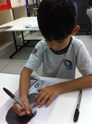 A atividade foi realizada em duas etapas. A primeira etapa foi a observação do rosto e a segunda foi produzir com caneta de retro projetor em papel transparente o que observaram.